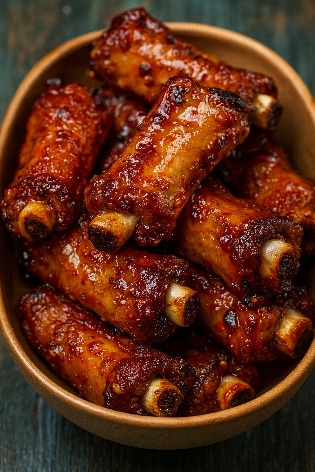 Saca las costillas del horno, pincélalas con la salsa y vuelve a hornear sin aluminio a 200 °C durante 15 minutos, hasta que caramelicen y queden brillantes.