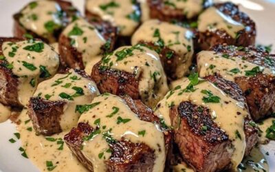 Trocitos de carne en salsa de mantequilla de ajo con crema de parmesano